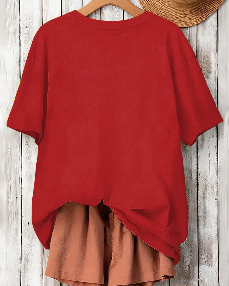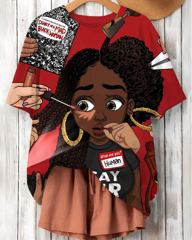Cute Black Girl Cartoon Print Crew Neck Short Sleeve T-Shirt