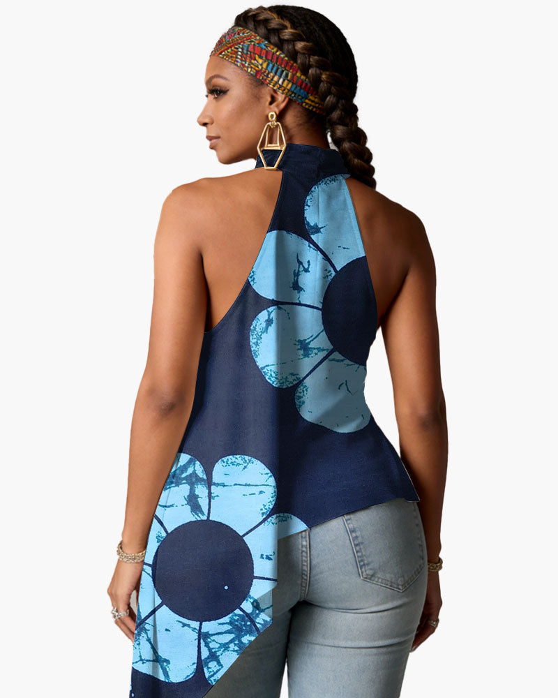 Women's Neck Slanted Top-African Tie-dye Art Navy Blue And Blue Ankara Fabric