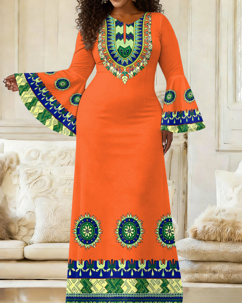 Women'S Elegant Bell-Sleeve Classic African Totem Prints Fitted Dress