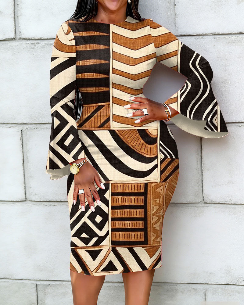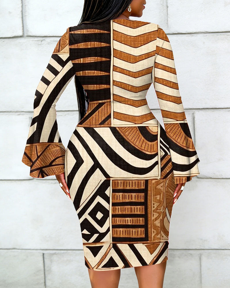 African Abstract Art Print Flared Sleeves Mini Dresses