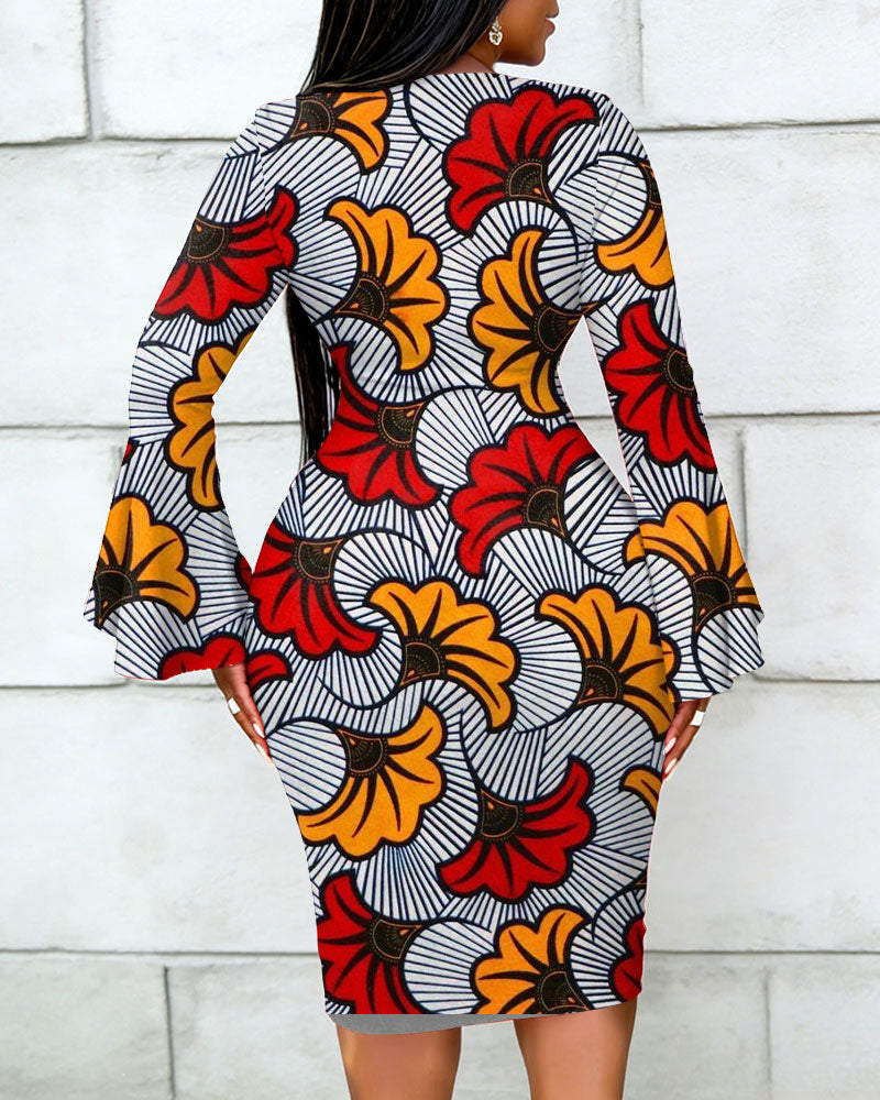 Ankara African American Culture Print Patchwork Round Neck Bell Sleeve Bodycon Long Dress