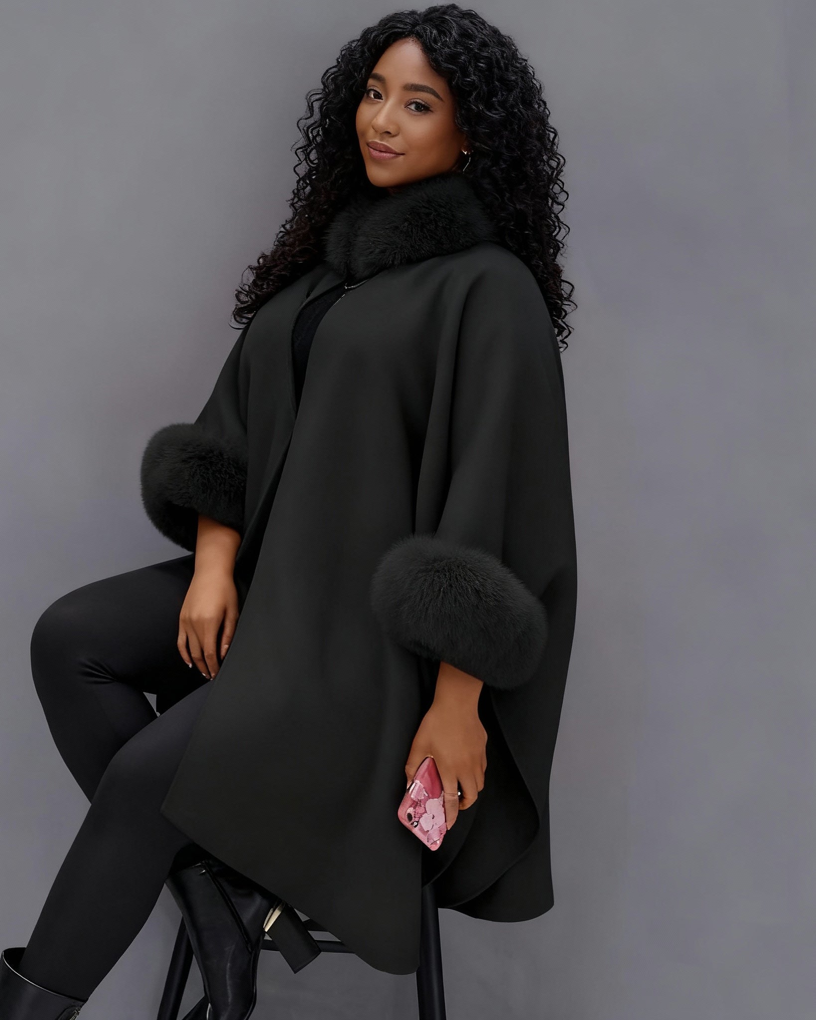Autumn And Winter Large Rabbit Fur Collar Mid-length Woolen Coat Elegant Cape Shawl Hepburn Style Woolen Large Size Coat