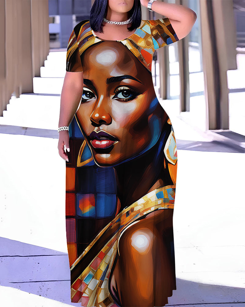 Beautiful Black Women Oil Painting Round Neck Short Sleeved Pocket Dress