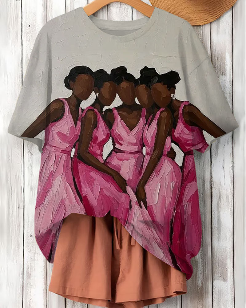 Black Woman Art Print Pink Dress Crew Neck Short Sleeve T-Shirt