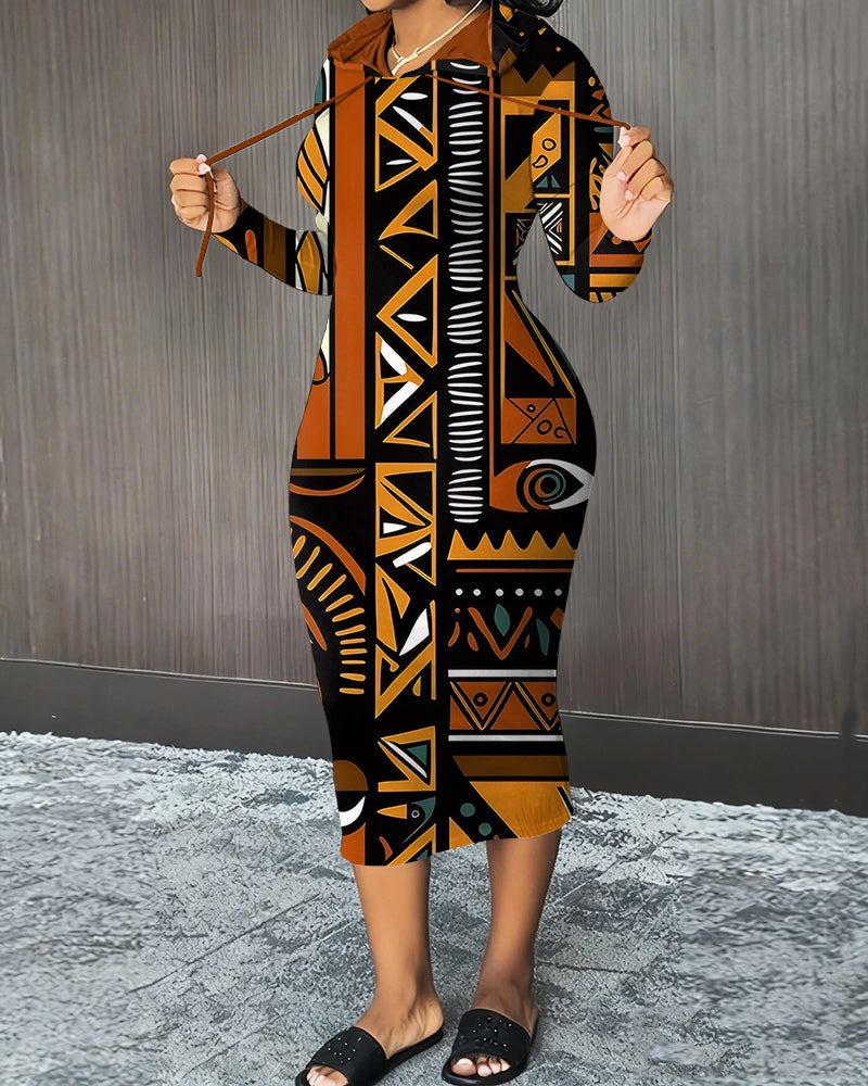 Classic Black Cultural Tribal Totems Print Hooded Dress