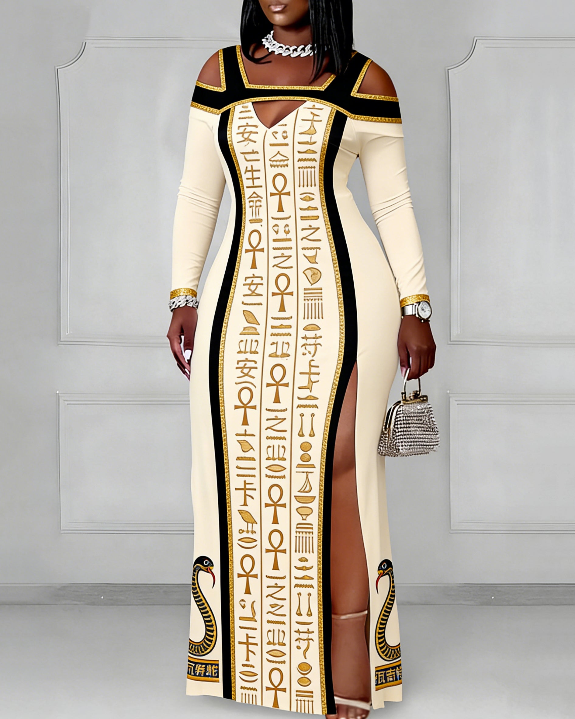 Cutout Off-shoulder V-neck Egyptian Totem Stripe Patchwork Long Sleeve Bodycon Dress