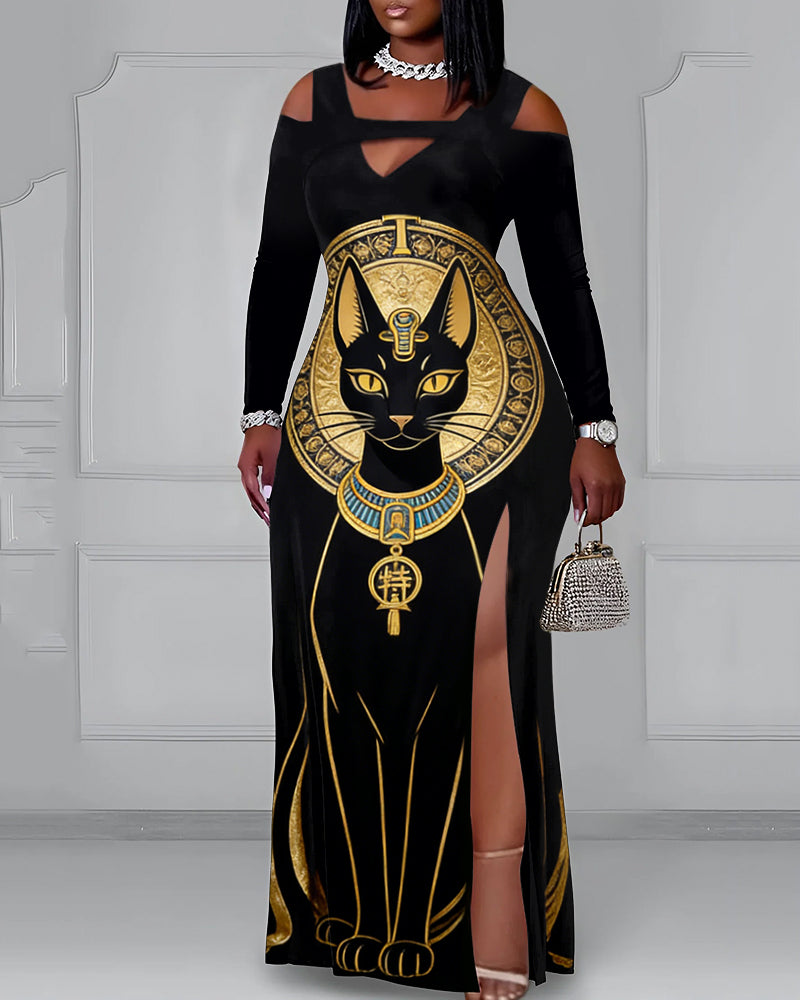 Cutout Off-shoulder V-neck Egyptian Vintage Cats Long Sleeve Bodycon Dress