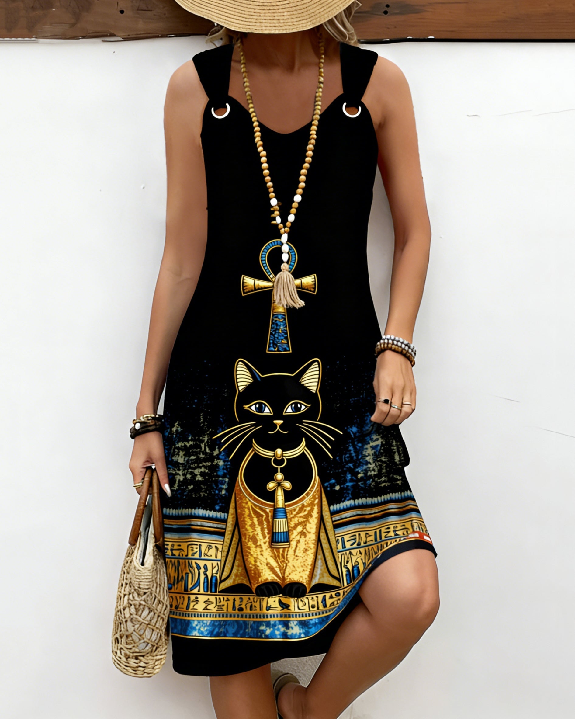 Egyptian Cat Cross Prints Circular Ring A Line Sleeveless Dress