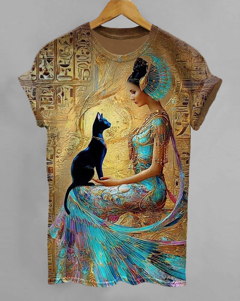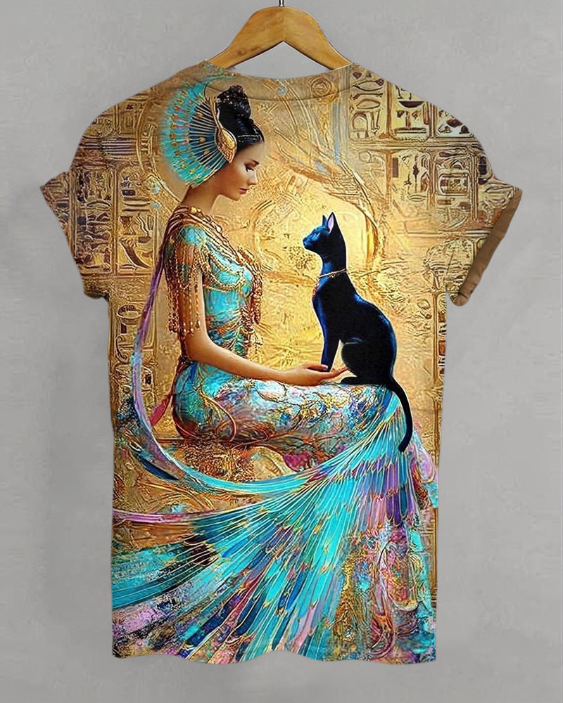 Egyptian Goddess and Black Cat Print Crew Neck Short Sleeve T-Shirt
