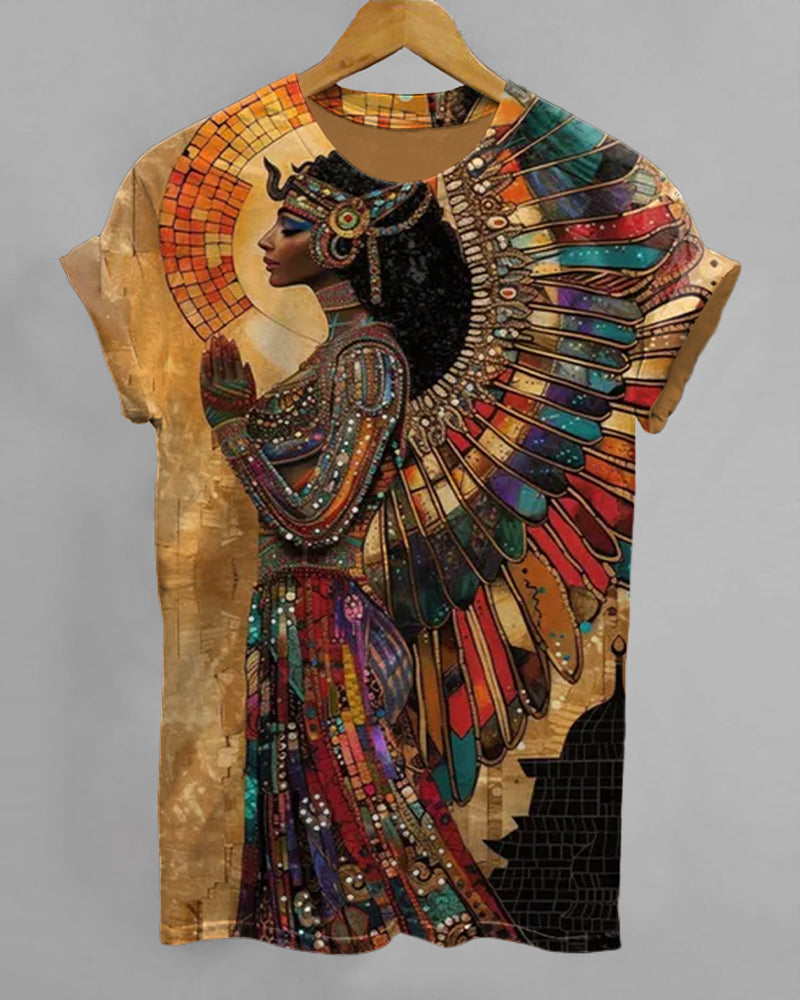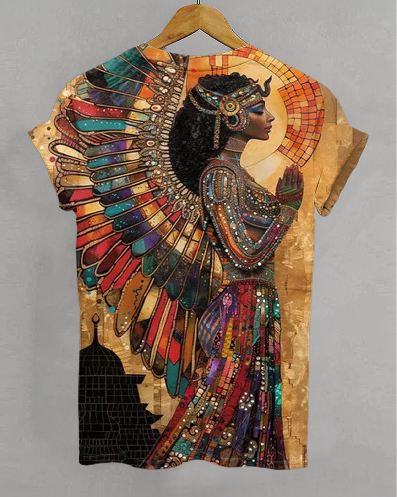 Egyptian Goddess Prayer Print Crew Neck Short Sleeve T-Shirt