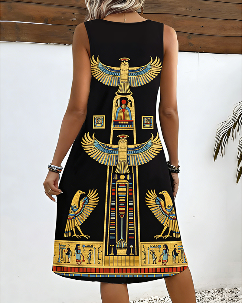 Gold Egyptian Totem Prints Circular Ring A Line Sleeveless Dress