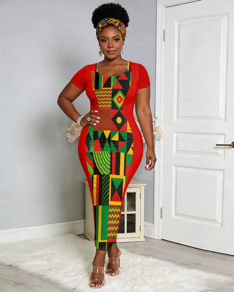 Ankara African American Culture Print Patchwork Round Neck Bell Sleeve Bodycon Long Dress