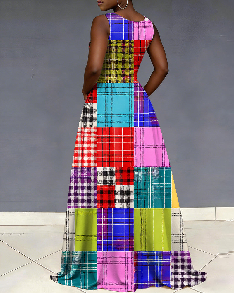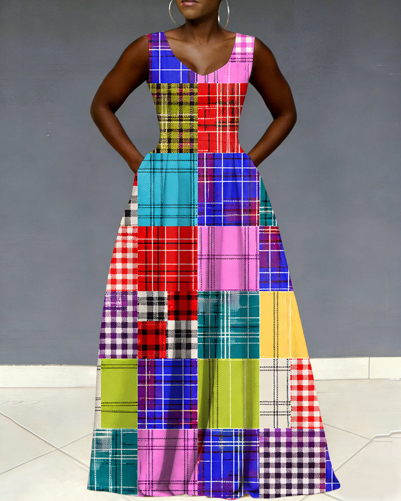 V Neck Multi-colored Checkered Patchwork Print Sleeveless Pocket Maxi Dress